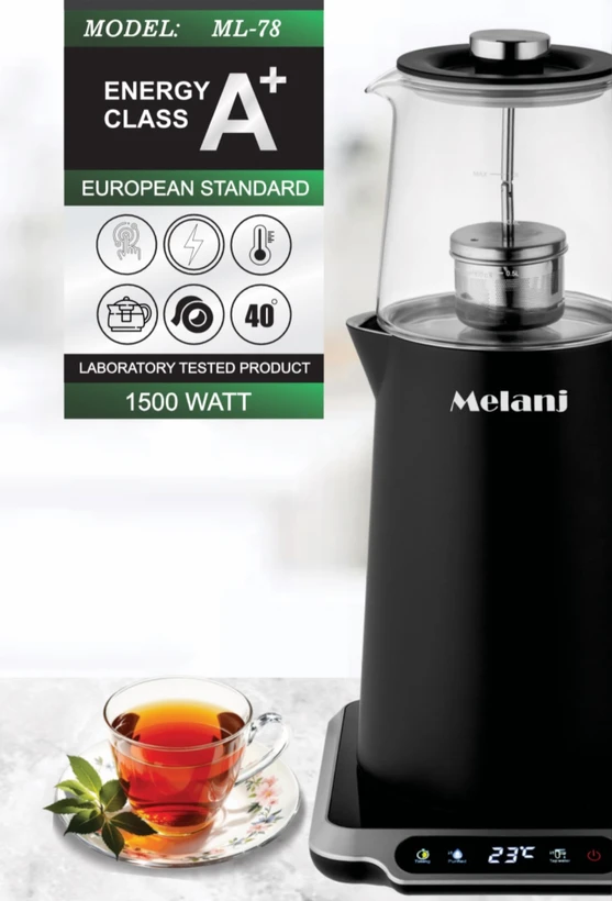 معرفی چای‌ساز ملانژ مدل ML-78چای‌ساز ML-78یکی از مدل‌های پیشرفته و مدرن برند ملانژ است که با توان 1500وات و طراحی دیجیتال، تجربه‌ای سریع، دقیق و کاربرپسند برای تهیه چای ارائه می‌دهد. این مدل با ترکیب زیبایی، قدرت و کارایی بالا، گزینه‌ای عالی برای خانواده‌ها و دفاتر کاری محسوب می‌شود. کنترل دیجیتال و قابلیت‌های هوشمند چای‌ساز ملانژ ML-78دارای پنل کنترل دیجیتال است که تنظیم دما و استفاده از قابلیت گرم نگه‌داشتن را بسیار آسان کرده است. کاربر می‌تواند به راحتی دمای دلخواه را انتخاب کرده و در تمام طول روز چای گرم و تازه بنوشد. قوری پیرکس 0/9لیتری و کتری استیل 1.7 لیتری قوری پیرکس شفاف و مقاوم، با ظرفیت 0/9لیتر، امکان تهیه چای برای چند نفر را به‌راحتی فراهم می‌کند. کتری استیل ضد زنگ با ظرفیت 1.7 لیتر نیز با سرعت بالا آب را به نقطه جوش می‌رساند و از دوام و طول عمر بالایی برخوردار است. طراحی شیک و عملکرد مطمئن طراحی زیبا، رنگ‌بندی چشم‌نواز و ساختار مقاوم چای‌ساز ML-78آن را به گزینه‌ای جذاب برای هر آشپزخانه یا محیط کاری تبدیل کرده است. استفاده آسان، قابلیت‌های دیجیتال و کیفیت ساخت بالا، این مدل را در رده چای‌سازهای پرفروش و محبوب قرار داده است.